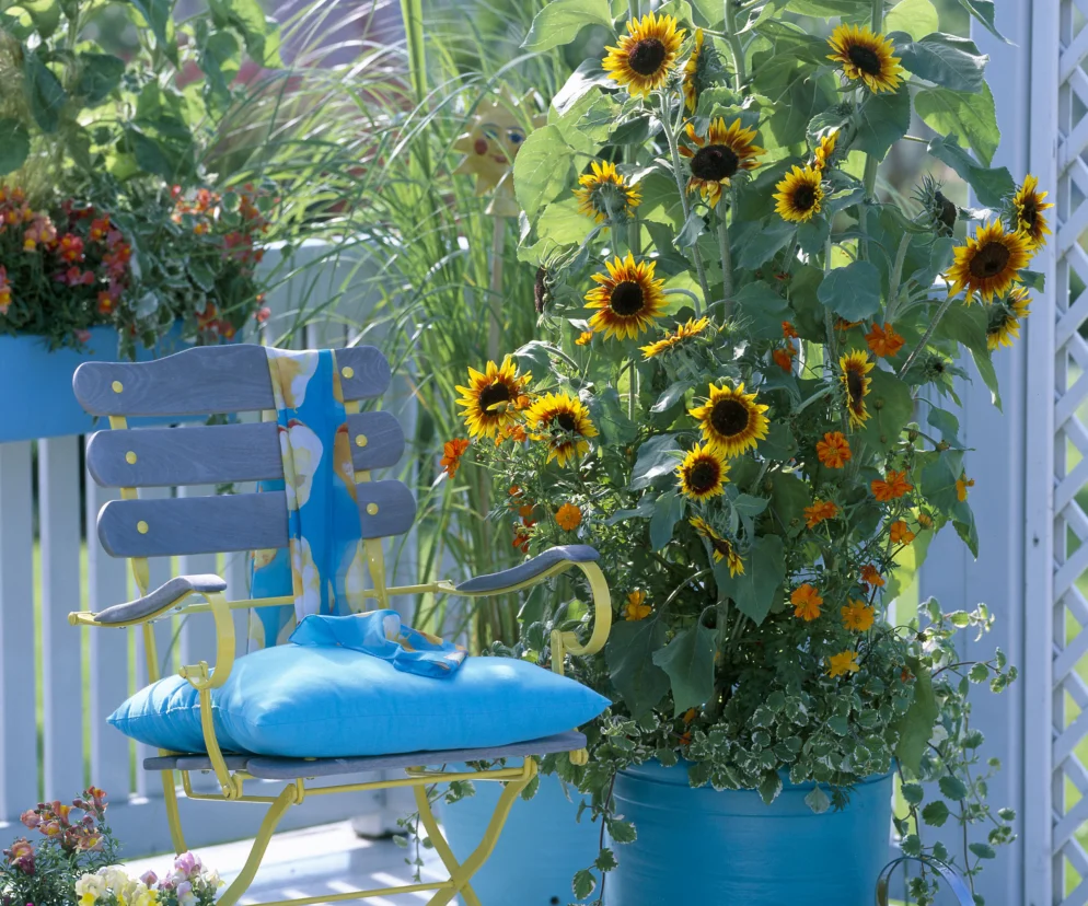 Jak sadzić słonecznik na balkonie? Raz posadzony nie powinien być przesadzany – pamiętajmy o tym, tworząc balkonowe kompozycje. Od razu wybierzmy odpowiedni pojemnik, który nie przewróci się później pod ciężarem kwiatów.