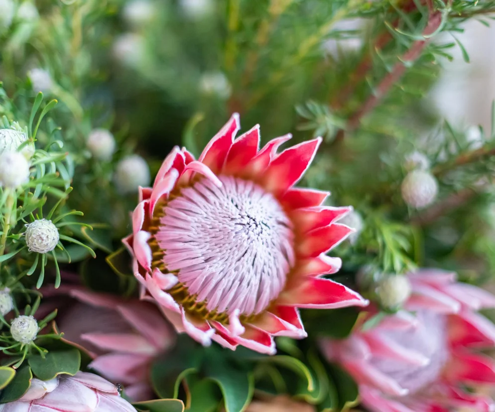 Protea z jej intensywnymi, dużymi kwiatami wprowadza do kompozycji niecodzienny, elegancki charakter, jednocześnie będąc łatwą w pielęgnacji rośliną.