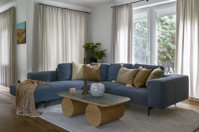 Salon z niebieskim narożnikiem i masywnym drewnianym stolikiem kawowym.