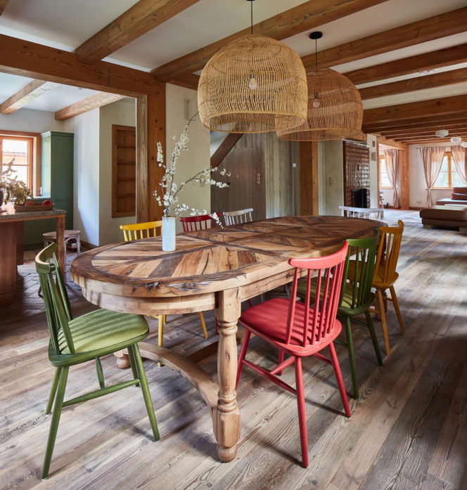 Wygodna jadalnia z dużym dębowym stołem o łagodnym, owalnym kształcie blat z manufaktury Regalia.