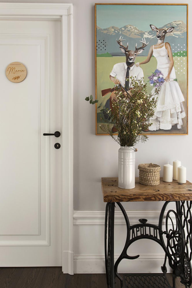 Białe ściany podkreślają ciekawą fakturę drzwi wejściowych.