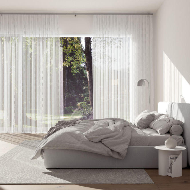 Modna dekoracja okien -zwiewne firanki do sypialni.