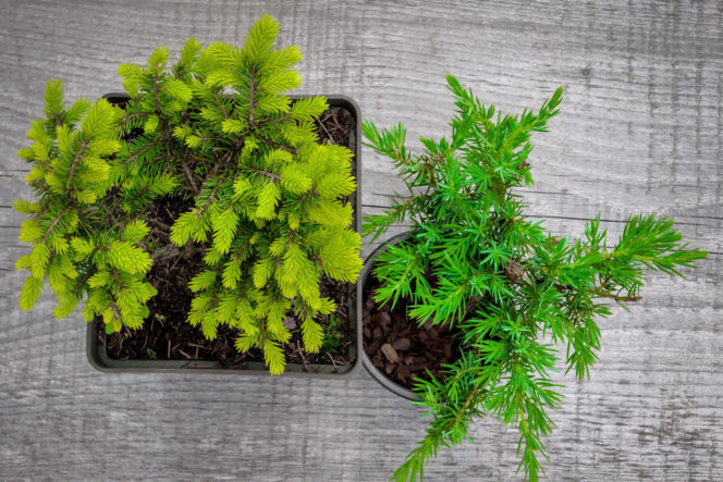 Świerk i jałowiec w doniczce.