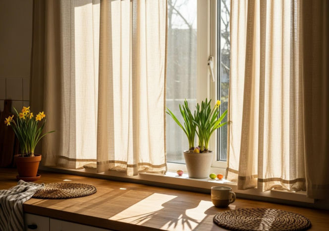Lekkie lniane zasłony i mała wiosenna dekoracja nadają kuchni codziennego, ciepłego klimatu, idealnego na wiosenny poranek.
