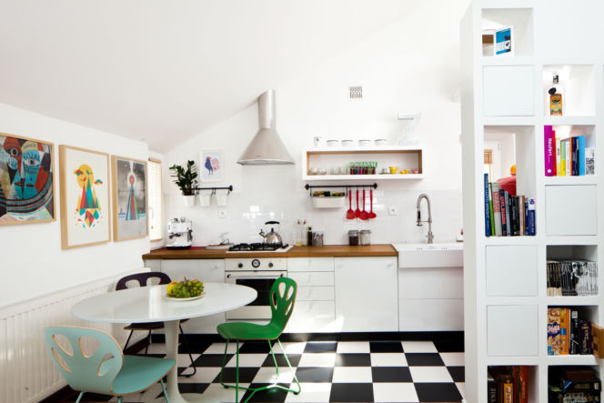 Otwarta kuchnia w kawalerce na osiedlu z lat 60. XX wieku została urządzona z odwołaniami do tamtych czasów. Tę część podkreśla czarno-biała szachownica z płytek. Czarny cokół ciągu roboczego płynnie przechodzi w takąż listwę przypodłogową. To efektowne wykończenie, które sprawia, że kafelki się „nie rozpływają się”, są trzymane w ryzach. Wyposażenie nawiązuje do mody wnętrzarskiej z tamtych czasów. Lekkie ażurowe krzesła z metalu i laminowanej sklejki (Maple 02, Iker) oraz stół na jednej nodze dobrze się prezentują się na „kracie”. Kolorowe krzesła, chochle oraz reprodukcje (m.in. grafika z okładki albumu en2ak – Minerva, Mayhem and Margaritas) dobrze współpracują z szachownicą, ożywiając urządzone w bieli wnętrze. Granicę miedzy aneksem a pokojem podkreśla nie tylko inna podłoga, ale także regał robiony na zamówienie (również meble kuchenne, Zupart Studio). Szafki i dwustronnie otwarte półki nawiązują geometrycznymi podziałami do matematycznej precyzji posadzki. Na kolejnym zdjęciu można zobaczyć skryty za regałem i ścianką fragment kuchni.