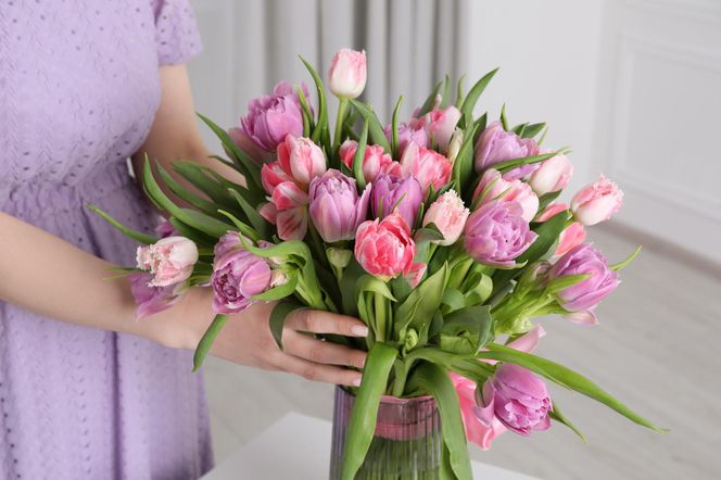 OBWÓD ZAMKNIĘTY Stolik kawowy lub taca to świetne miejsce na stworzenie kilkuelementowej kompozycji. Najważniejszy jest w niej oczywiście wazon z bukietem (na zdj. tulipany, szafirki, żonkile), do którego dobrano świece (zielone jak łodygi) oraz świeczniki (w tonacji płatków kwiatów).