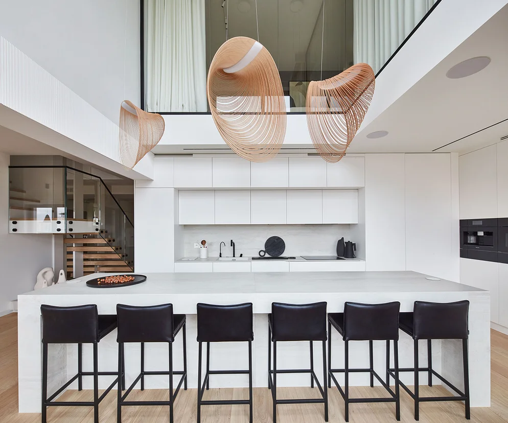 Dzięki antresoli, która znajduje się nad kuchnią, to pomieszczenie jest niezwykle przestrzenne. Utrzymano je w bieli i delikatnej, bardzo rozbielonej szarości, którą widzimy w tym pomieszczeniu w postaci kamienia. Obłożono nim całą gigantyczną, niezwykle długą wyspę, nad którą zawisły designerskie lampy.