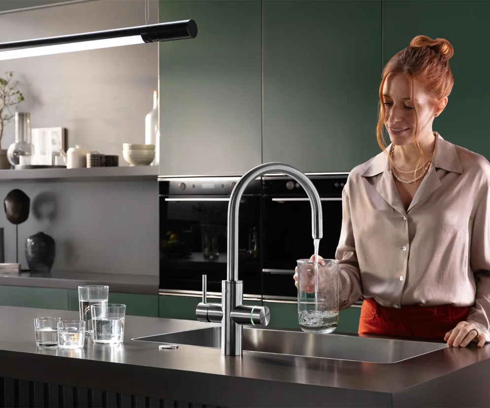 Mythos Water Hub to bateria filtrująca do kuchni, która oferuje nie tylko wodę ciepłą i zimną, ale także cztery warianty filtrowanej: w temperaturze pokojowej, schłodzoną, gazowaną i wrzącą.
