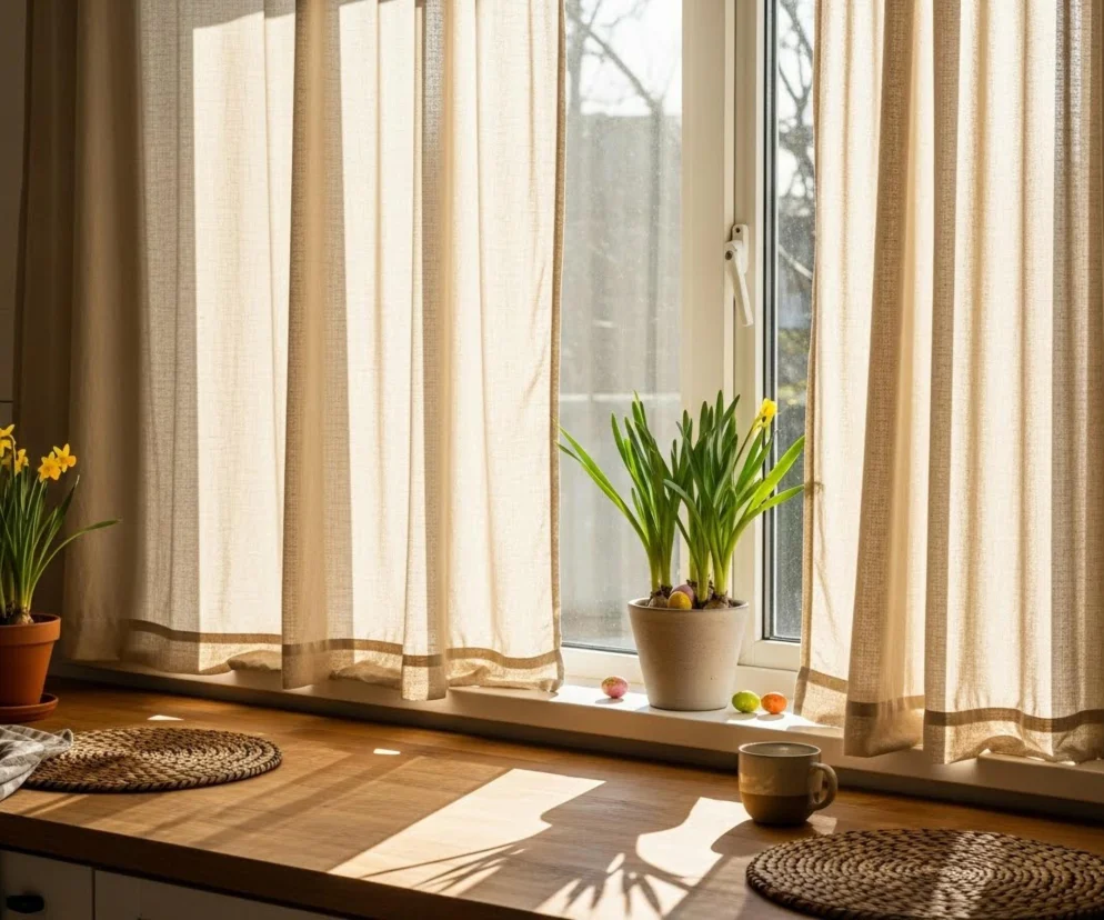 Przez dekady śnieżnobiała firanka była symbolem czystości i klasyki. Jednak w nadchodzącym sezonie projektanci mówią jasno: czysta biel w kuchni bywa zbyt surowa. Największym hitem nadchodzącej Wielkanocy jest kolor „Whipped Butter” (ubite masło). To ciepły, kremowy odcień, który natychmiast sprawia, że wnętrze staje się przytulne i „słoneczne”, nawet gdy niebo jest zachmurzone.