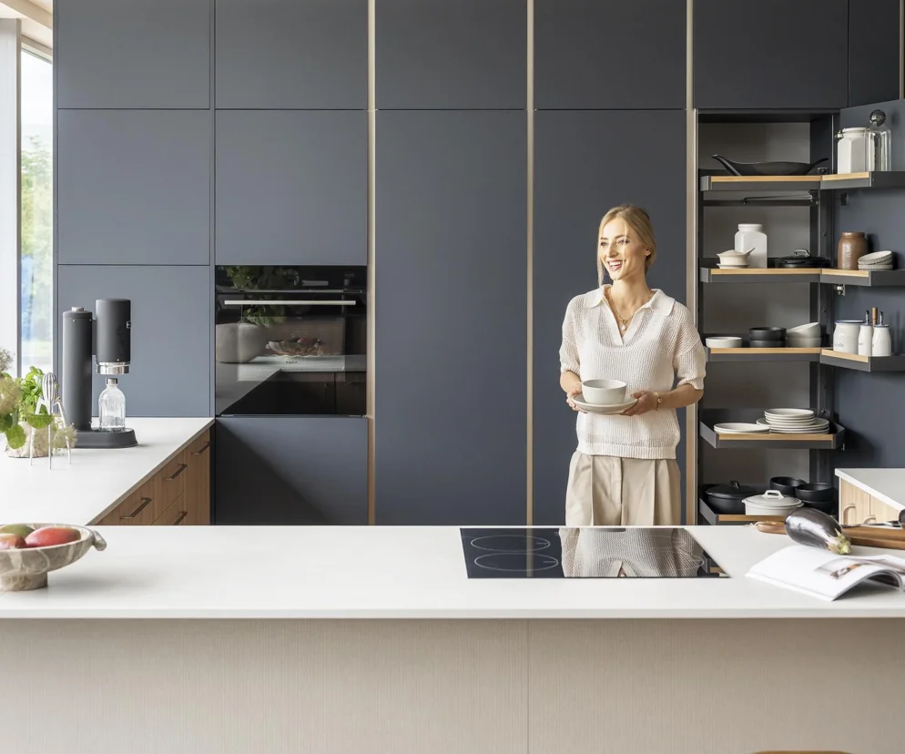 Gładkie, matowe fronty w odcieniach szarości – od jasnego gołębiego tonu po głębszy grafit – to dobry wybór, jeśli planujemy kuchnię, która nam się nie opatrzy. Ta kolorystyka nie zdominuje wnętrza, lecz będzie stanowić eleganckie tło dla codziennego życia. Szarość porządkuje przestrzeń, podkreśla proste linie zabudowy i pozwala wybrzmieć detalom.