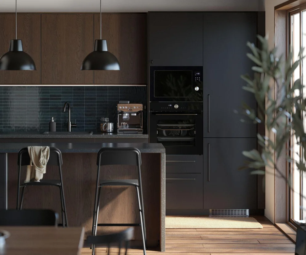 Modne fronty kuchenne. Czarna kuchnia z drewnianym blatem