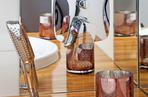 Bradzo efektownie wygląda bateria wannowa zamontowana na lustrze. Najpierw w ścianie zainstalowano podtynkowy zestaw iBox (firmy Hansgrohe). Następnie w lustrze wycięto otwór na baterie; potem przyklejono je na ścianę. Na końcu zamontowano mieszacz zewnętrzny (podłączenie do główki prysznica i wylewki znajduje się pod obudową wanny). Znikająca kabina prysznicowa wykonana została z gładkiego szkła. Brodzik, tak jak całą podłogę łazienki, zrobiono z lakierowanego drewna tekowego (czyści się je delikatnymi preparatami do ceramiki łazienkowej). Wyżłobiono w nim jedynie spadek do odpływu liniowego (woda spływa przez wąską szczelinę pod listwą maskującą). Stojąc pod deszczownicą, z drewnem pod stopami, ma się wrażenie jakby było sie na statku i padał na nas prawdziwy deszcz.