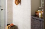 W aranżacji użyto: Deska tek, DLH; płytki: Percorsi Bianco 30x60 cm, Percorsi Beige, 15x30 cm, Percorsi Nero 15x30 cm, MARAZZI; brodzik Pacyfik, 120x80 cm, KOŁO; umywalka nablatowa Vero, 60x47 cm, DURAVIT; bateria natryskowa podtynkowa, drążek niklowany, słuchawka z masażem, TRES; grzejnik biały Ewelina, 60x96 cm, MONKIEWICZ; meble: fornir naturalny, heban makassar; bezuchwytowe, ALPI.
