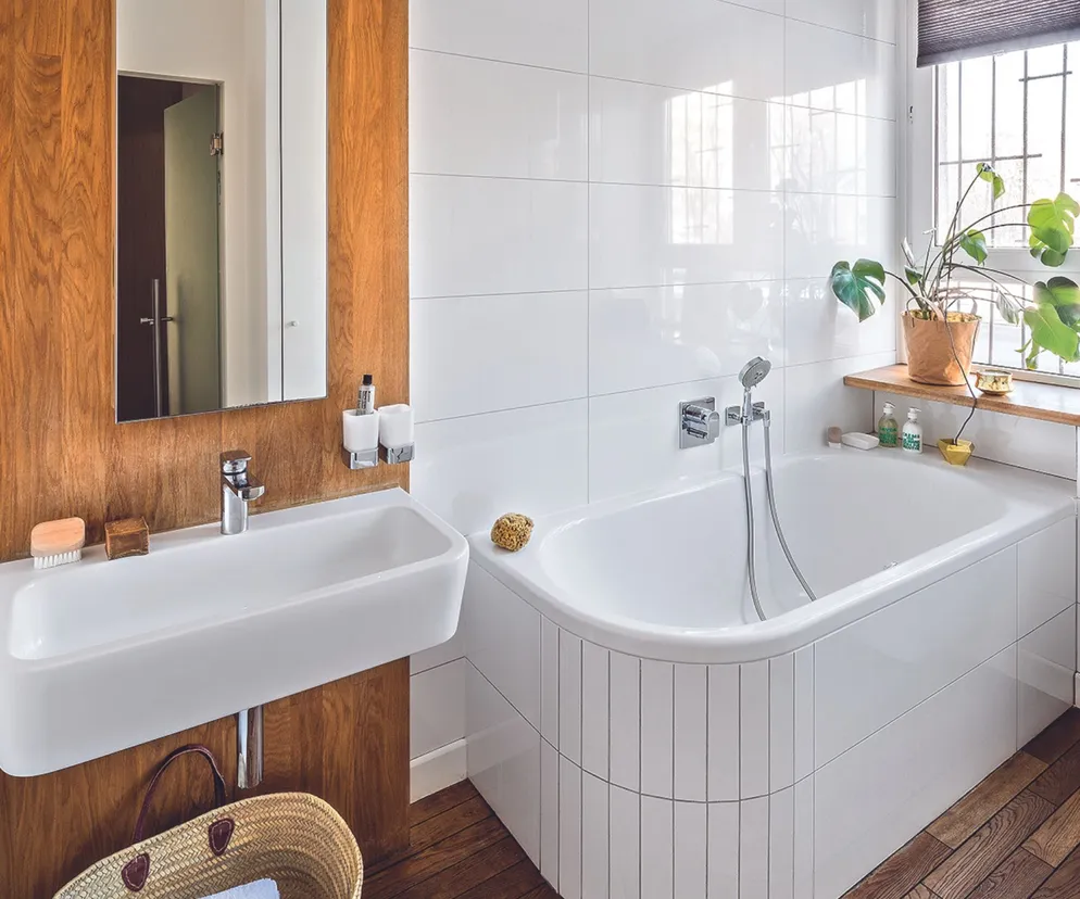 Do pomieszczeń o podwyższonej wilgotności zaleca się głównie gatunki egzotyczne, jak tek, bambus, sapeli, które nie odkształcają się na skutek kontaktu z wodą i są odporne na działanie pleśni. Z doświadczenia wiem jednak, że w łazienkach równie dobrze sprawdza się rodzimy dąb – pod warunkiem, że zostanie odpowiednio zaolejowany. Olej uodparnia deski na działanie niekorzystnych czynników. Nie zamyka porów drewna, pozwala mu oddychać. W prezentowanej łazience wykonałem z olejowanego dębu panel za umywalką, parapet oraz podłogę. Dobrze służy nam już ponad dziewięć lat. Dla zwiększenia szczelności posadzki zastosowaliśmy kit szkutniczy, który wypełnił szpary między deskami i zabezpieczył je przed rozsychaniem. Jak pielęgnować taki parkiet? Co trzy miesiące należy czystą, wysuszoną podłogę potraktować specjalnym olejem i pozostawić na 2–3 godziny, aż preparat się wchłonie.