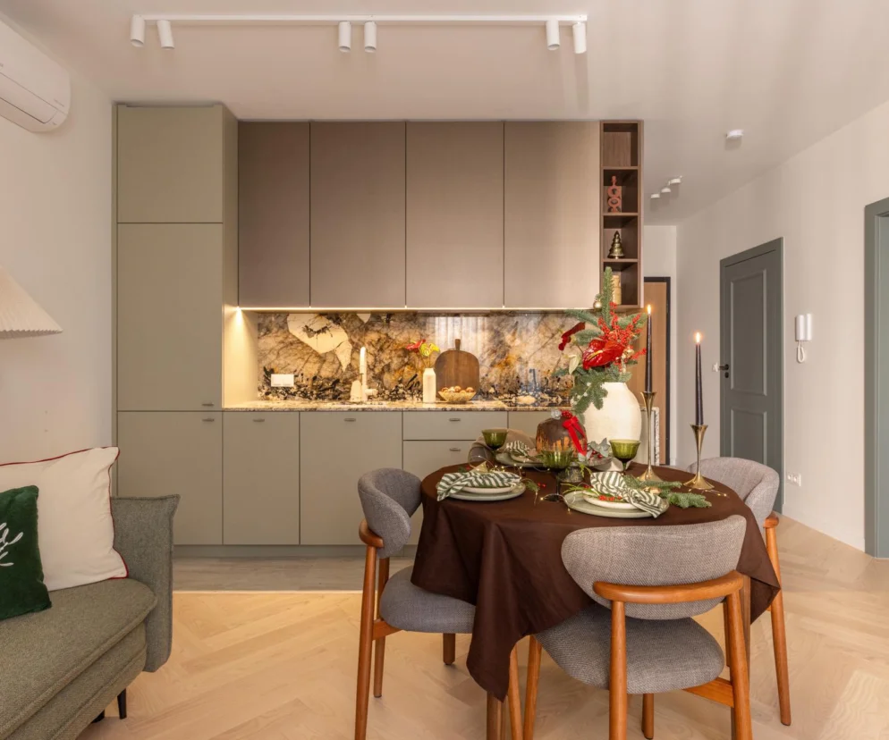 To mieszkanie jest propozycją dla osób, które cenią subtelny luksus i nienachalny styl. Dzięki starannie dobranym materiałom, harmonijnej kolorystyce i minimalizmowi w dekoracjach, wnętrze stało się przestrzenią, w której można odpocząć od miejskiego zgiełki i jednocześnie poczuć magię świąt.