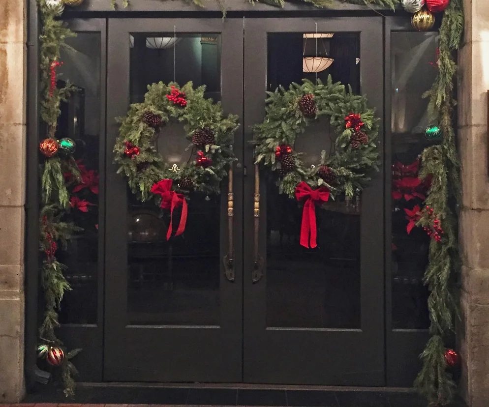 - Girlanda wokół framugi drzwi – elegancka, z dodatkiem światełek.