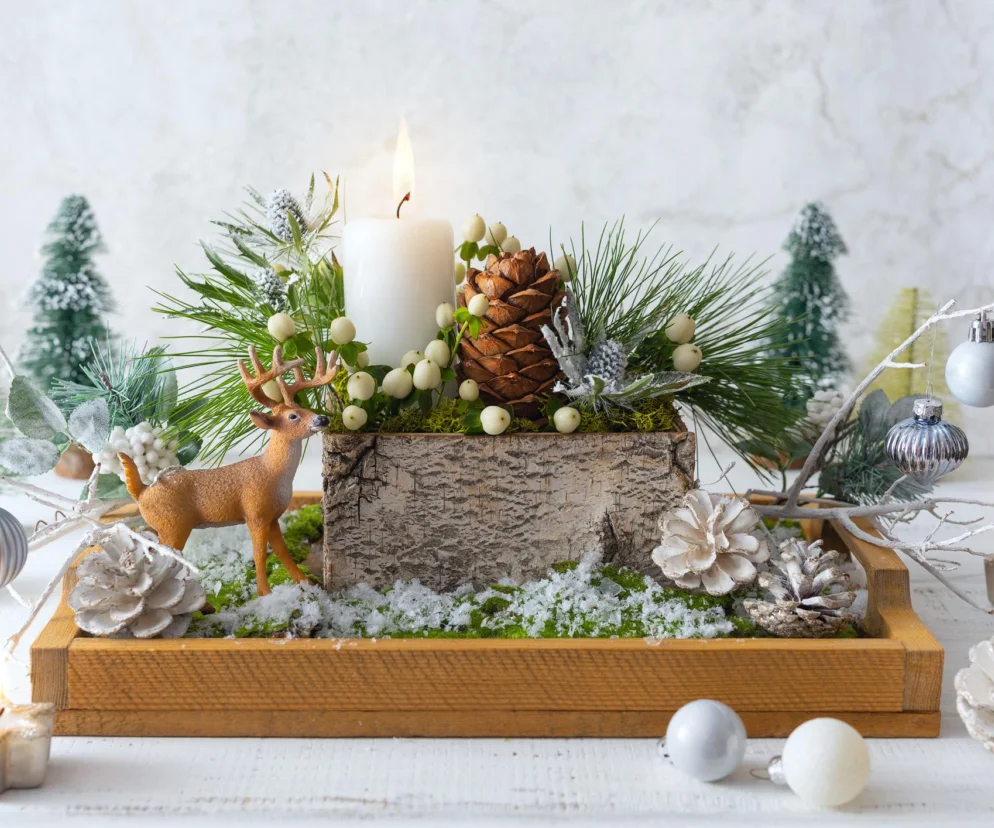 Aby taka kompozycja zyskała świąteczny urok, warto przyprószyć ją sztucznym śniegiem. Wtedy dodatkowo harmonizuje z zimową aurą, jeśli na zewnątrz pada śnieg. Dodatkowe ozdoby? Do roślin możesz dodać bombki, drobne łańcuszki lub szklane paciorki.