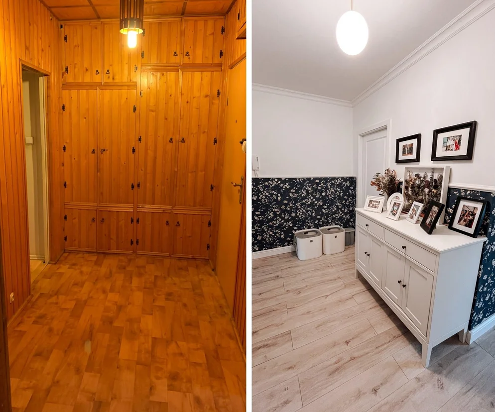 Choć moda na boazerię wraca to jednak ta 30-letnia, która była w mieszkaniu nie nadawała się do przerobienia, więc usunęliśmy ją w całości.