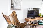 Aranżacja salonu daje możliwość poruszania się pomiędzy małymi i mobilnymi meblami wyznaczonymi ścieżkami. Granatowa sofa, komoda pod schodami, mobilny barek i fotel to jedyne meble w salonie. Początkowo projektantka i właściciel mieli pomysł na schody kręcone jednak zajęłyby zbyt dużo miejsca. Ostatecznie pojawiły się nowoczesne proste schody pod którymi znalazło się miejsce na stylową komodę z telewizorem, kolekcję vinyli i designerski fotel „Butterfly” z 1938 roku – także upolowany na aukcji internetowej.