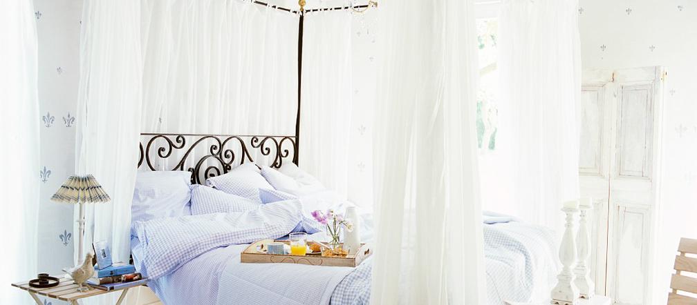 Jeśli twoje łóżko w sypialni jest wyposażone w cztery słupki w rogach i konstrukcję podtrzymującą daszek, masz duże pole do popisu. Możesz zyskać i zasłony, i baldachim. W małej sypialni lepiej zastosować lekkie, jasne materiały tylko częściowo zasłaniające łóżko. W niskim wnętrzu sypialni dekorację zawieś pod sufitem i niech spływa na boki łóżka dzięki podpięciu.