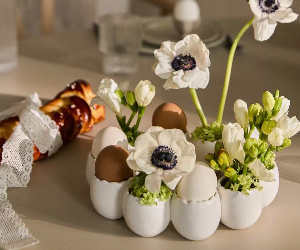 Wypróbuj kontrastowe zestawienia. Złociste dodatki, które rozświetlą stół, połącz z plecionymi podkładkami, ozdobami w matowych odcieniach szarości i niebieskiego. Dodadzą mu powagi. Pomysł numer dwa: delikatne szafirki w matowych wazonach przypominających jajko stworzą surową, ale lekką dekorację.