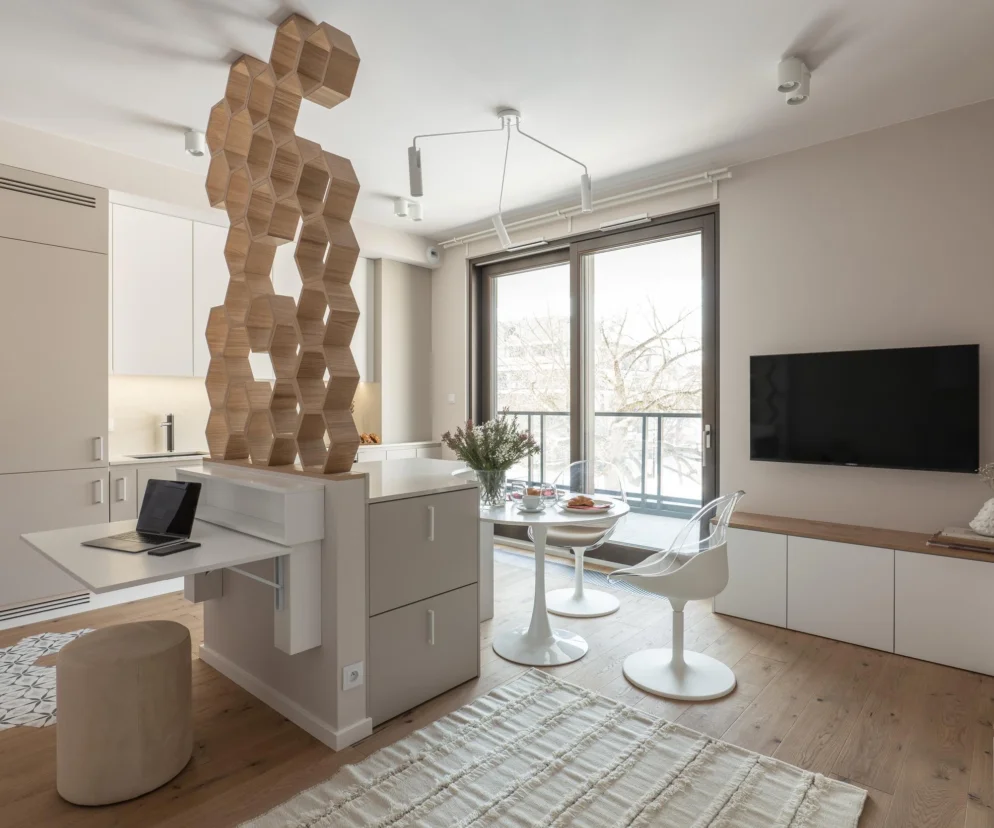 Strefa dzienna łączy w sobie funkcję wypoczynku, pracy i spożywania posiłków. Bazą pozostaje stonowana paleta barw. Biel zestawiono z beżem i naturalnym odcieniem podłogi. Ten spokojny duet pozwala wybrzmieć charakterystycznym formom: lekkiej, ażurowej ściance o heksagonalnym rysunku oraz obłościom stołu, lamp i krzeseł.