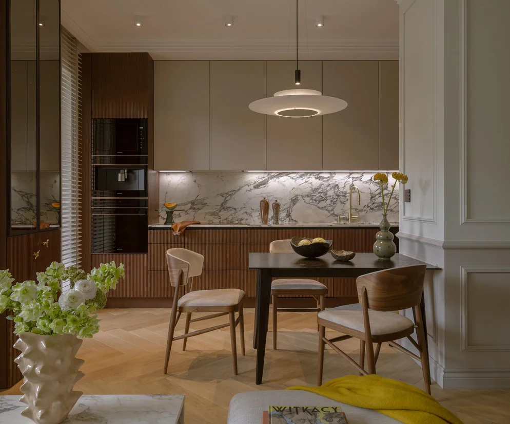 Każdego wieczora mieszkanie nieco się zmienia. Światło zmienia swój kąt, sącząc się po ścianach, odbijając w marmurze i złotych detalach. Jest tu pełnoprawnym bohaterem – raz miękko otula, kiedy indziej wydobywa faktury materiałów: gładkość kamienia, miękkość tkanin, rytm sztukaterii.
