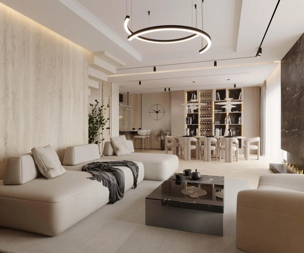 Sercem domu jest przestronna strefa dzienna, gdzie salon, jadalnia i kuchnia tworzą jedną, harmonijną całość. Wnętrze emanuje elegancją i spokojem, zapewniając idealne miejsce do rodzinnego wypoczynku i wspólnego spędzania czasu. Estetyczne detale oraz przemyślany układ pomieszczeń podkreślają wyjątkowy charakter tej przestrzeni, czyniąc ją centralnym punktem domu.