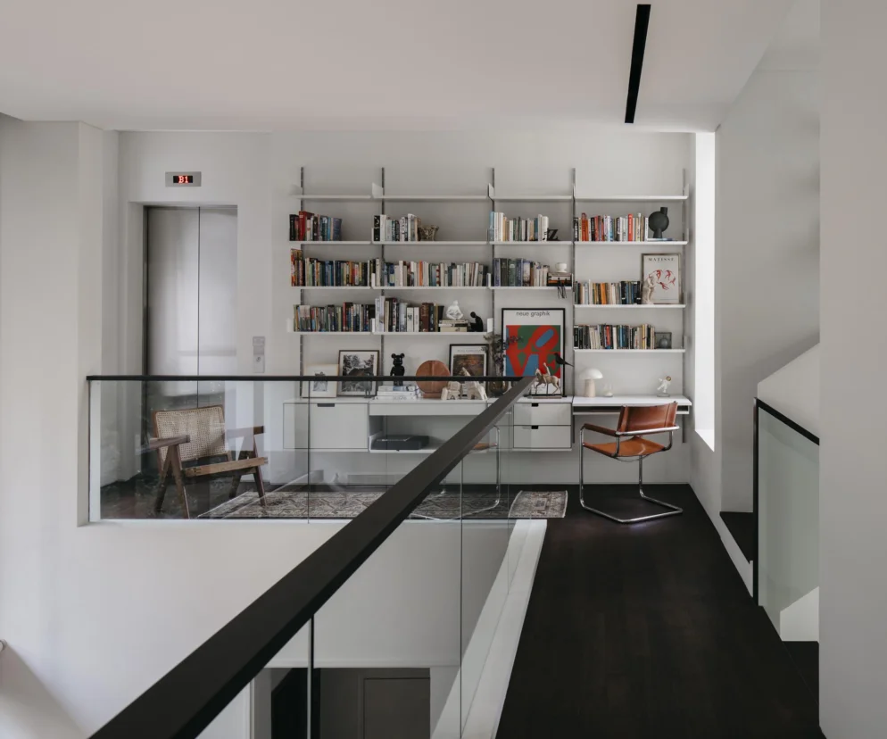 Także druga kondygnacja – z biblioteką i gabinetem – została włączona w ten dialog. Otwarta na salon poniżej, umożliwia wizualny i dźwiękowy kontakt pomiędzy poziomami. Układ mebli, zarówno we wnętrzu, jak i na patio, sprzyja rozmowie i współobecności, niezależnie od tego, gdzie aktualnie znajdują się domownicy.