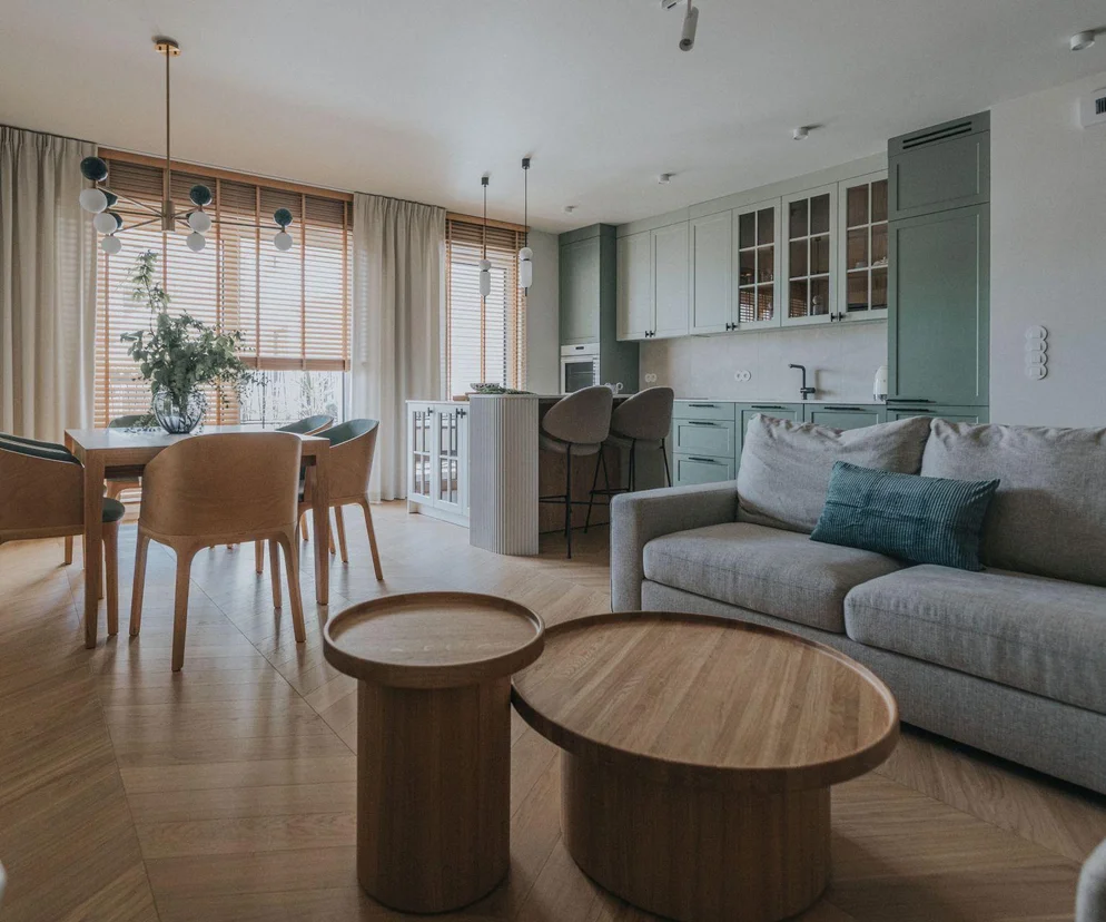 Część ścian działowych zniknęła, dzięki czemu salon, kuchnia i jadalnia tworzą jedną przestrzeń, w pełni otwartą na południowe światło wpadające przez balkon oraz zielony dziedziniec z wiekowymi platanami. Rolę spoiwa wyznaczył kolor — zieleń pojawiająca się zarówno na ścianach wykończonych tynkiem strukturalnym, jak i w detalach wykończenia.