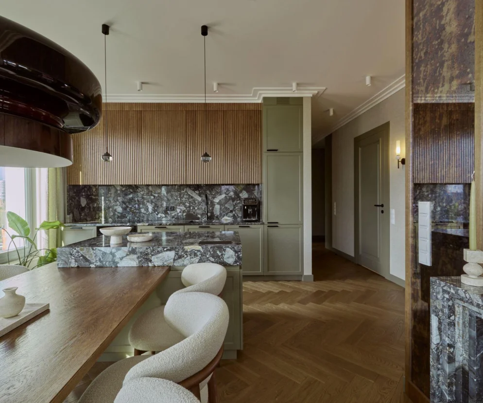 Kuchnia w tym apartamencie stanowi istotny element przestrzeni dziennej. Z dużą wyspą i nowoczesnym, odpowiednio dobranym wyposażeniem, jest nie tylko funkcjonalna, ale także estetycznie spójna z resztą wnętrza. Kamienne blaty, których rysunek powtarza się także w innych częściach mieszkania, tworzą jednolitą i elegancką powierzchnię.