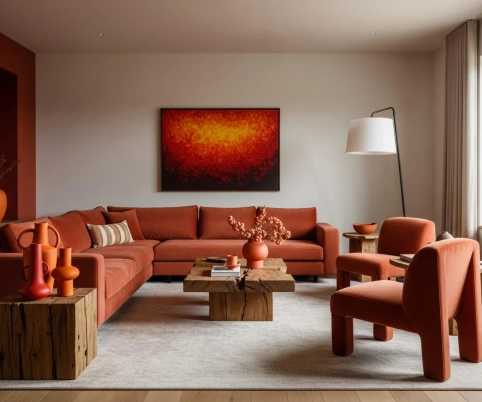 - Ognista czerwień i oranż: Ale nie w wersji neonowej. Szukamy odcieni terakoty, palonej cegły i ochry. To kolory, które dodają wnętrzu temperatury i pobudzają do działania.