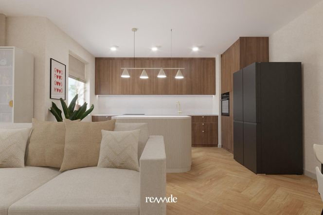 Na podłodze mamy panel w jodełkę, a na ścianach farbę lime wash, której niejednorodna struktura tworzy ciekawy efekt we wnętrzu. Kuchnia w ciepłym orzechowym drewnie tworzy kontrast z delikatnymi odcieniami piasku i beżu. Centralnym jej punktem jest wyspa obudowana ryflowanym panelami z płyty MDF.