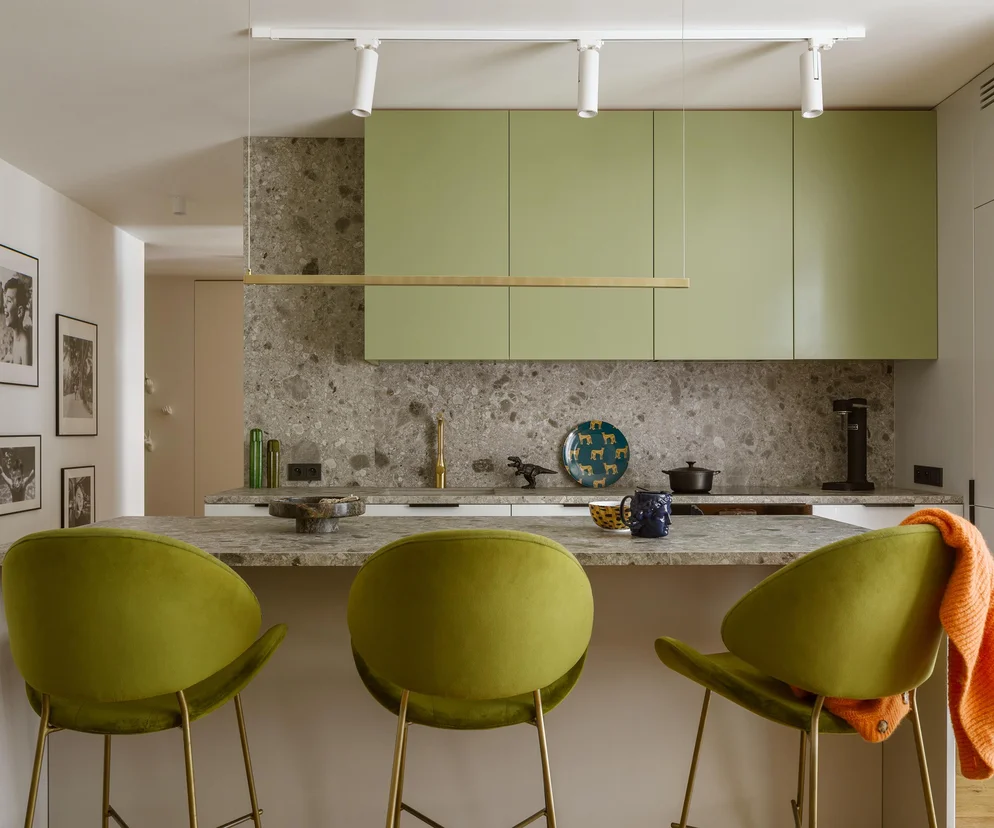 Oliwkowa zabudowa kuchni współgra z jasnym lastryko, a czarno-biały osprzęt Gira podkreśla elegancję całości.
