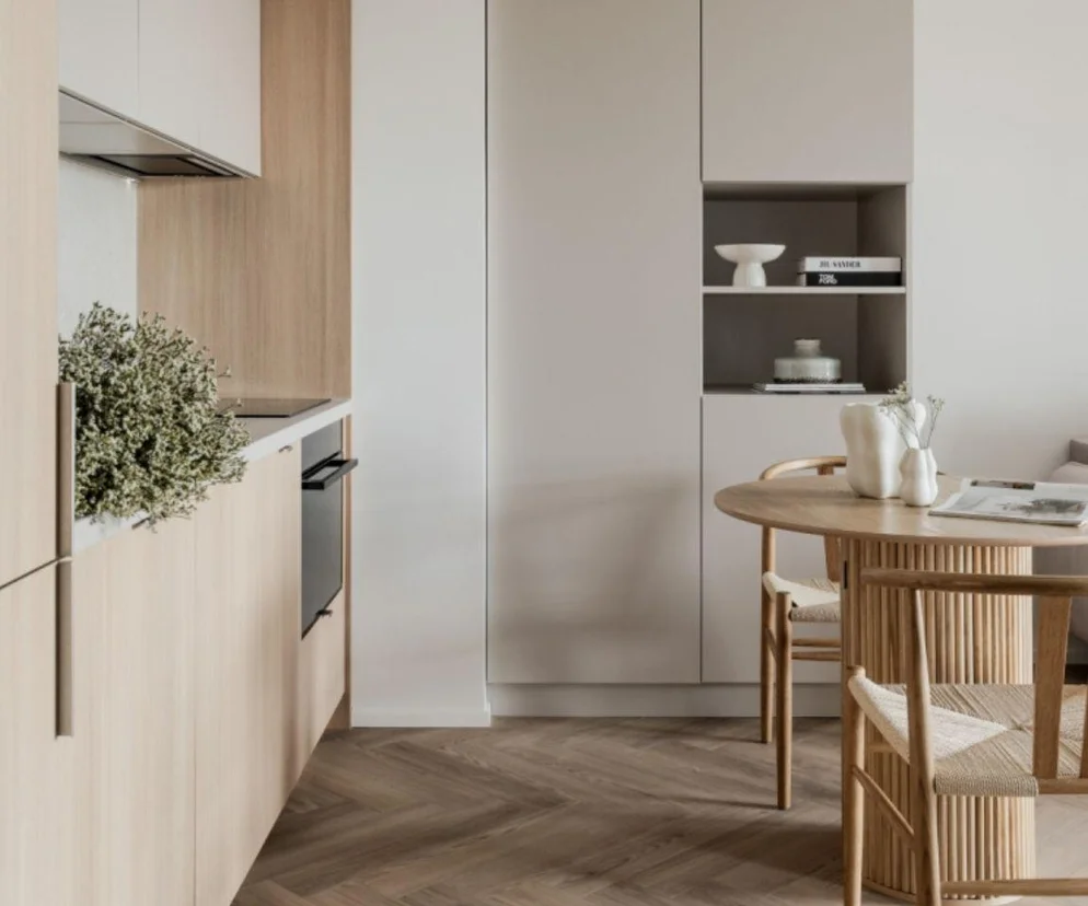 Jest oszczędne w wyrazie, z maksymalnym wykorzystaniem przestrzeni, w odcieniach neutralnych – współczesnych i zarazem ponadczasowych. Naturalne, jasne drewno ociepla całość. Szafkę RTV, stół i stolik kawowy łączy, poza materiałem, wykończenie w formie lameli – wylicza Martyna Midel.