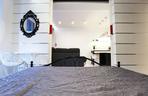 Część nocna została ukryta za przesuwnymi drzwiami z efektowną fototapetą. Pomysłowe rozwiązanie pozwala odizolować sypialnię od dziennej części małego mieszkania i wprowadza atmosferę intymności. Dodatkowo, z perspektywy salonu, przesuwne drzwi z fototapetą stanowią jeden z dekoracyjnych aspektów aranżacji. Bohaterem projektu sypialni jest wygodne łóżko, które dopełniono jedynie niewielkimi szafkami nocnymi w kontrastującym kolorze białym. Na uwagę zasługuje także dekoracja ściany za łóżkiem, która nadaje wnętrzu szyku i stylu. W niewielkim pomieszczeniu udało się wygospodarować miejsce na mini garderobę, której funkcję przejęła szafa wnękowa z lustrzanymi frontami. Takie rozwiązanie optycznie powiększa małe wnętrze pokoju nocnego. Projekt łazienki został utrzymany w podobnym klimacie, do aranżacji salonu z aneksem kuchennym. W niewielkim wnętrzu króluje czerń z akcentem czerwieni, a tłem dla mocnego duetu jest czysta biel.