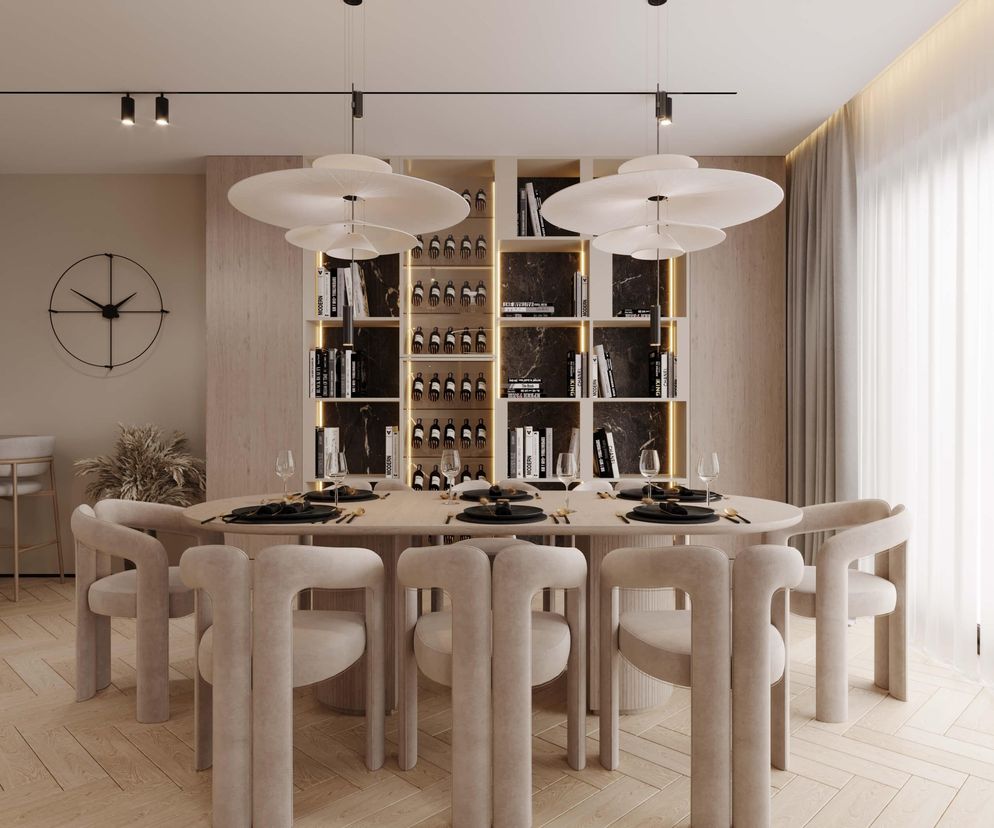 Jednym z ważniejszych aspektów tego projektu było oświetlenie. Zamiast ostrych, zimnych źródeł światła, postawiono na miękkie, rozproszone oświetlenie, które tworzy atmosferę intymności. Mocny, wizualny akcent to lampa nad stołem – efektowna, ale też idealnie wkomponowana w całość.