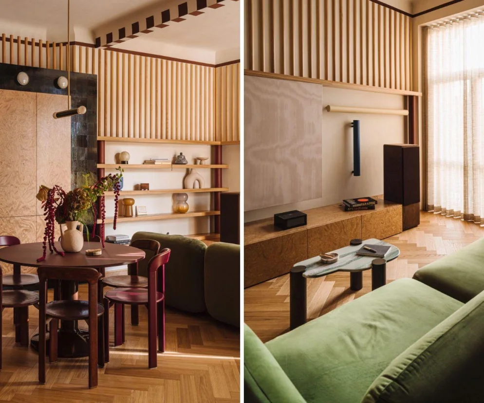 Mimo że przed remontem wnętrze nie miało szczególnej wartości dekoracyjnej, architekt odnalazł w nim dwa elementy mogące stać się fundamentem nowej narracji: pary dębowych drzwi. Po renowacji stały się one jednym z najważniejszych akcentów, realnym łącznikiem z wcześniejszą historią mieszkania.