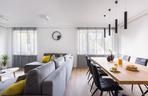 Część dzienna została zaprojektowana tak, by była wygodna na co dzień i podczas spotkań z przyjaciółmi. W salonie jest strefa jadalnia z dużym stołem z drewnianym blatem i wyraźnie wyodrębniona część wypoczynkowa z pokaźnych rozmiarów szarą sofą – prawdziwą królową salonu. Największe wrażenie na odwiedzających gościach robi jednak hol z lustrzaną ścianą kryjącą dwie pary drzwi: do sypialni i łazienki. Pomysłem wartym podpatrzenia jest wnęka z siedziskiem. Architekci Patryk Ławrynowicz i Justyna Kolasa zaprojektowali w holu też czarną szafę mieszczącą pralkę, środki chemiczne, domowe AGD. Za szafą znajduje się przejście do kuchni.