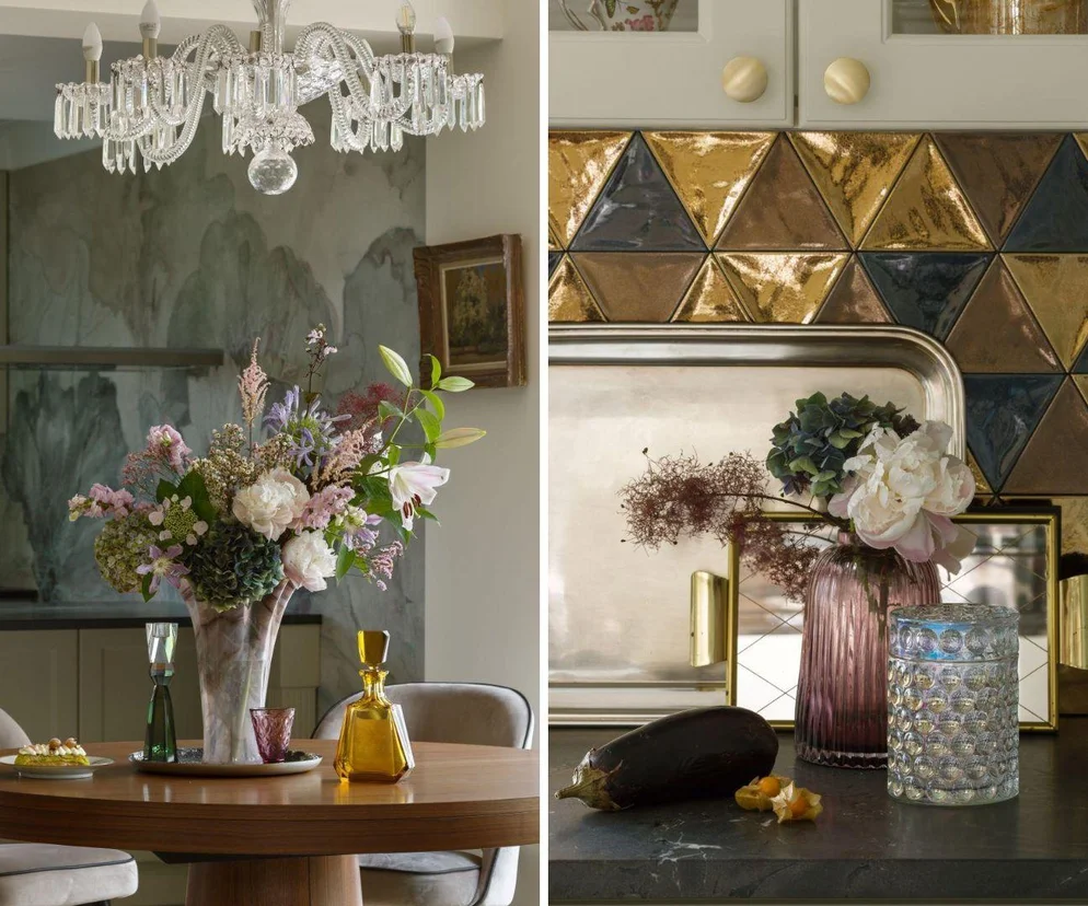 Wchodząc do kuchni, nie da się nie zauważyć tapety przedstawiającej ogromne kwiaty. Zajęła całą ścianę, ale nieco uwagi kradnie jej mozaika (Quintesenza), którą tworzą trójkątne złote i czarne kafelki.