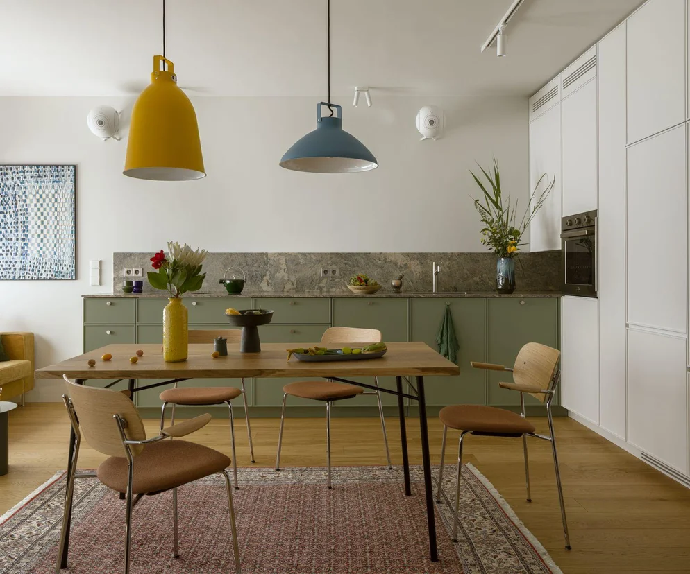 Przestrzeń ta pełna jest minimalistycznych mebli, które podkreślają lekkość aranżacji, ale zarazem nadają jej mocny charakter dzięki wyrazistym kolorowym akcentom. Dwie sofy w kontrastujących odcieniach, proste, ale solidne stoły i krzesła – każdy element został starannie dobrany, by stworzyć jednocześnie spójną i dynamiczną atmosferę.