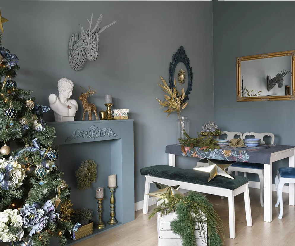 Farba o odcieniu Ciepły Bałtyk (Clean & Color, Dekoral) ujednoliciła go z tłem. Na tych chmurnych niebieskościach świetnie wyglądają dekoracyjne drobiazgi, które zmieniają się zależnie od pory roku i okazji – w grudniu pojawiają się lśniące złociście detale oraz gałązki jedliny.