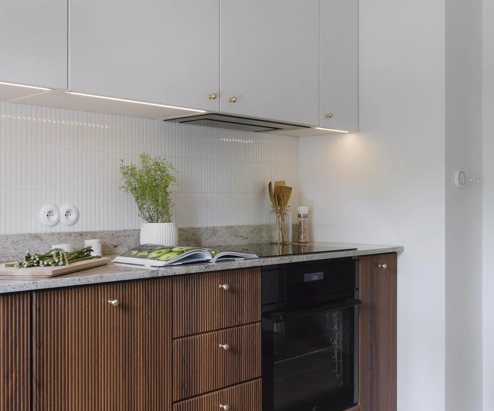 Dolna część zabudowy w kuchni wyróżnia się ryflowanymi frontami w odcieniu mahoniowym, które nawiązują do stylistyki mebli w salonie, łącząc elementy klasyczne z nowoczesnymi.