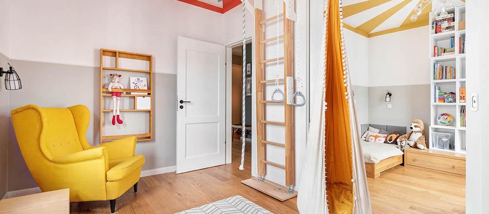 W bawialni jest drabinka gimnastyczna i podwieszany worek-huśtawka. Aby wyciszyć miejsce do spania, ściana przy łóżku ma odcień o dwa tony ciemniejszy niż reszta.
