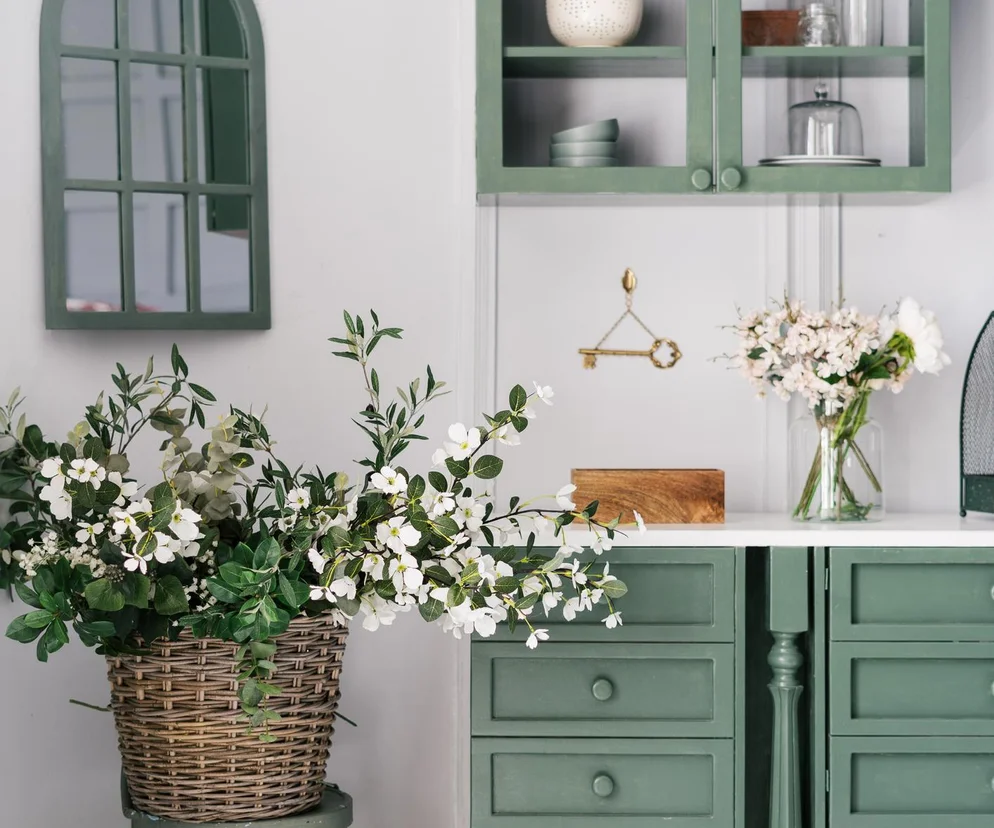 Meble – drewniane, często bielone – charakteryzują się frezowanymi frontami, przeszklonymi witrynami i ozdobnymi uchwytami. Na ścianach królują kwadratowe kafelki w odcieniach bieli lub delikatnych pasteli, a podłogę zdobią płytki ceramiczne lub drewniane deski.
