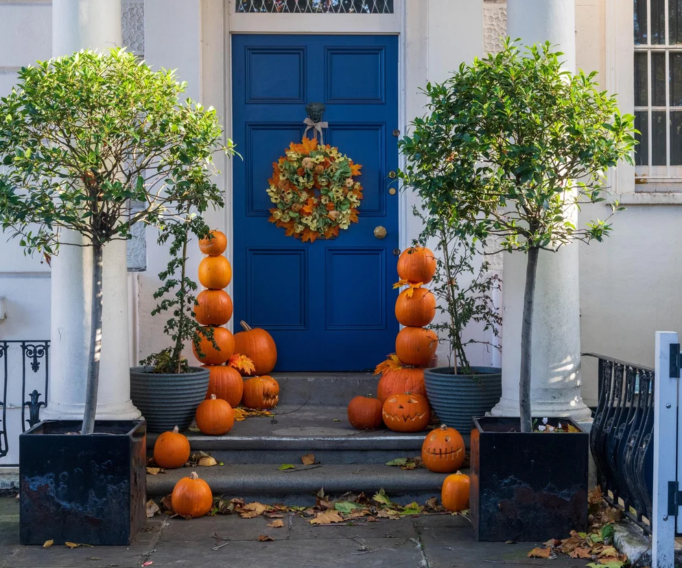 Jeśli chcesz poszaleć, to posadź model szkieletu lub czarownicę na krześle przed drzwiami, a wokół postaw dynie o różnych wielkościach, kształtach i kolorach. Tak z pewnością zaskoczysz swoich gości!