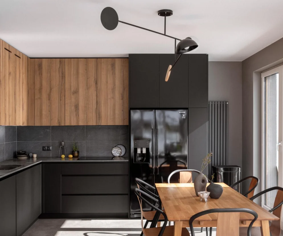 Mieszkanie w stylu loftowym. Czarna kuchnia z drewnem. Zdjęcia