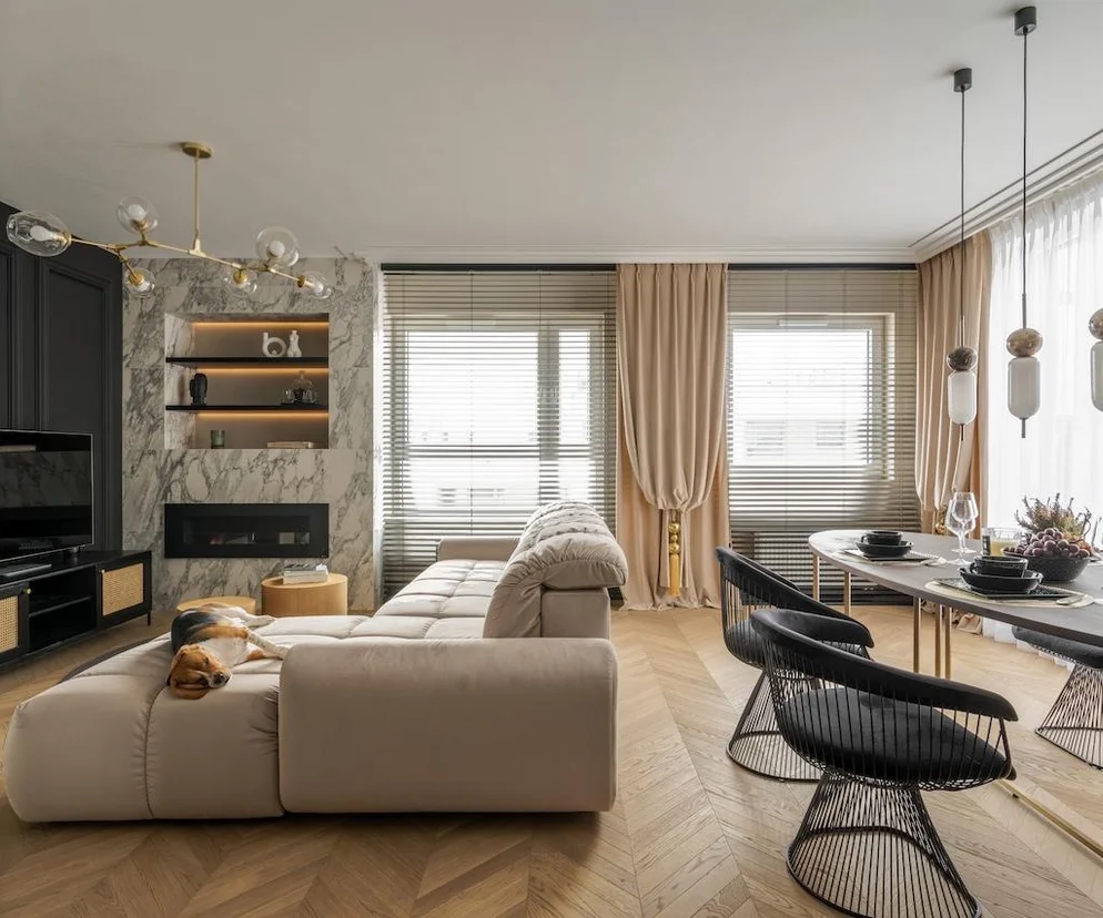 By podkreślić elegancki charakter apartamentu, architektka wprowadziła m.in. sztukaterie oraz drewnianą podłogę we wzór jodełki francuskiej, która w strefie wejścia została dodatkowo ozdobiona złotą bordiurą. Przytulność zapewnia ciepła gama kolorystyczna, beże, ale też złote dodatki, które kontrastują ze szlachetną czernią.
