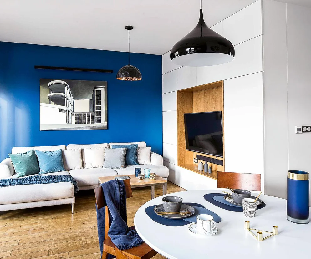 Podobnie ma być z tkaniną bouclé, matowymi czarnymi okuciami (krany, uchwyty, czarne detale) oraz tzw. "accent wall", czyli jedną ścianą we wnętrzu, mocno wyróżnioną (jak w przypadku ścianek za tv).