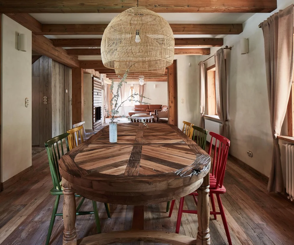 Pierwszoplanową rol w tym wnętrzu odgrywa stare drewno. I choć poziomy posadzek musiały zostać wyrównane, a same podłogi wymienione, znów chodzi się tu po wiekowych dechach.